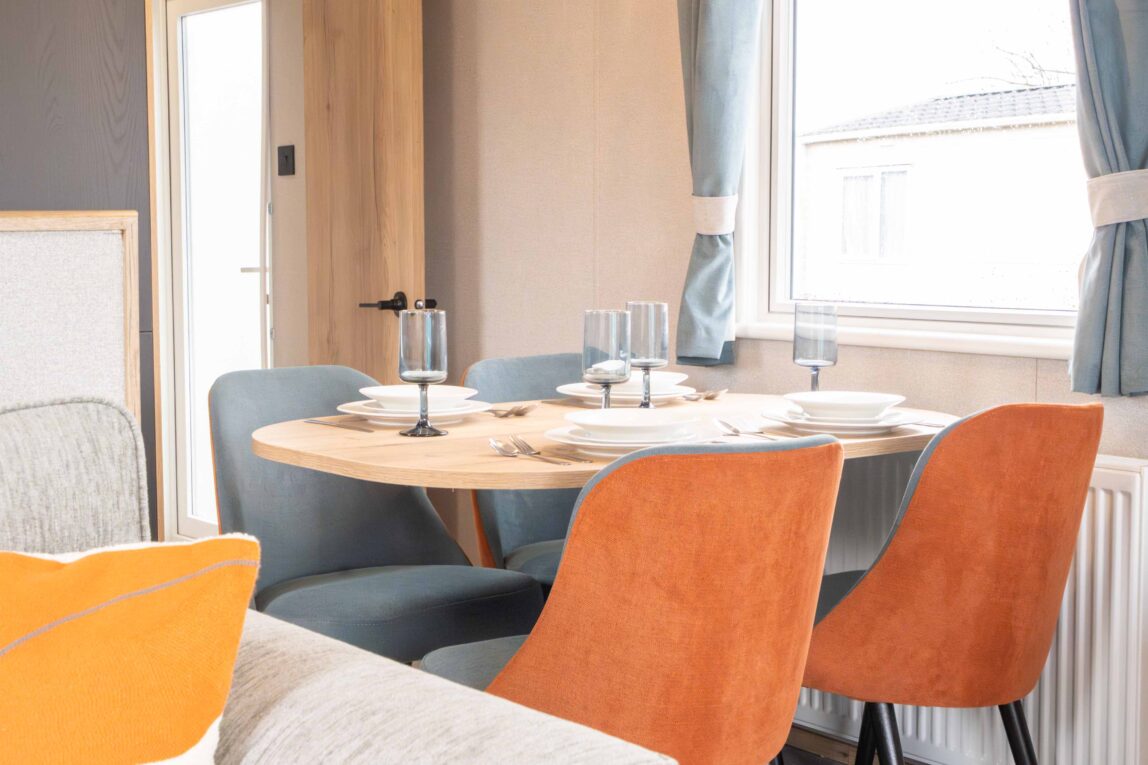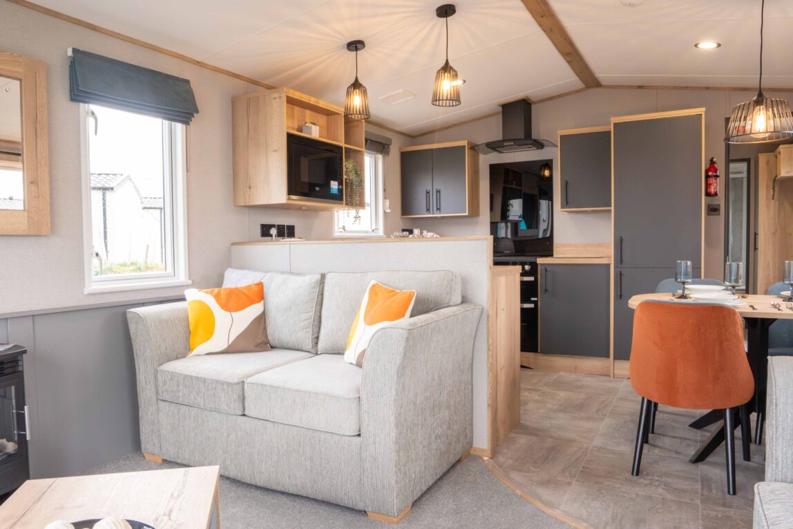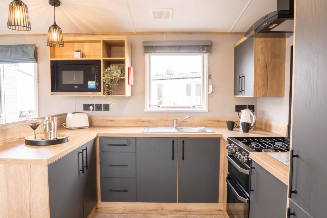The ABI St David brings personality to holiday living with carefully curated design details throughout. The sleek kitchen features charcoal grey units, black finishes and modern appliances, combining practicality with a striking, contemporary look.