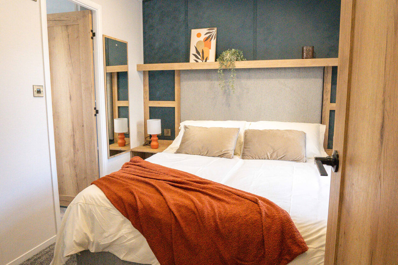 The Norwood’s interior is designed with a refined palette of greys, oak finishes, and navy blue accent walls, creating a sense of timeless luxury. The kitchen impresses with integrated appliances — think microwave, dishwasher, fridge/freezer — all complemented by soft-close doors and natural oak-effect worktops. USB charging points and antique-brass sockets add a subtle but very modern touch. In the lounge, a bespoke media unit backlit with LED lighting and a recessed electric fire add character, ambiance and function.
