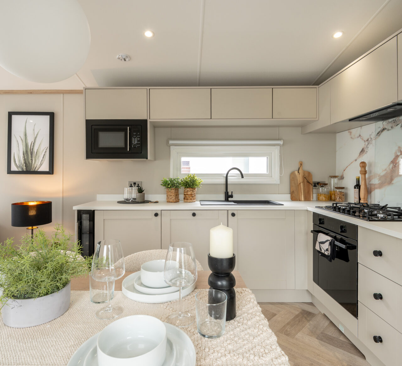 The lounge offers generous seating with freestanding sofas, giving you flexibility and a more homely feel. Large windows allow plenty of natural light to fill the space, helping it feel warm and welcoming throughout the year. Central heating and double glazing mean your holiday home is comfortable in every season, whether you’re enjoying summer sunshine or cosy winter breaks by the coast.