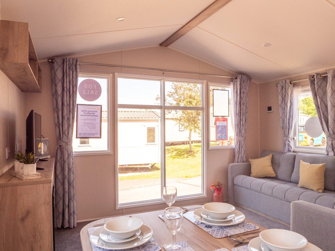 The open-plan lounge in The Willerby Linwood is ideal for family gatherings or cozy movie nights. A comfortable dining area creates a versatile space for meals, games, or socializing, allowing everyone to enjoy quality time together.