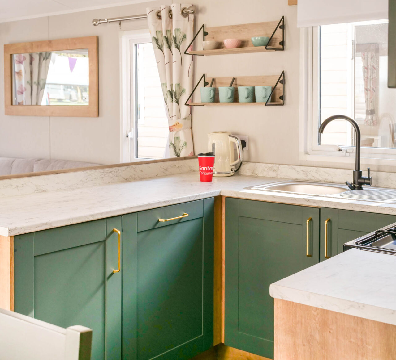 The kitchen in The Sierra features striking green cabinet doors and gold handles, complemented by splashes of pink in the fabric prints. This bold design makes the kitchen a standout feature, offering both style and practicality for holiday cooking.